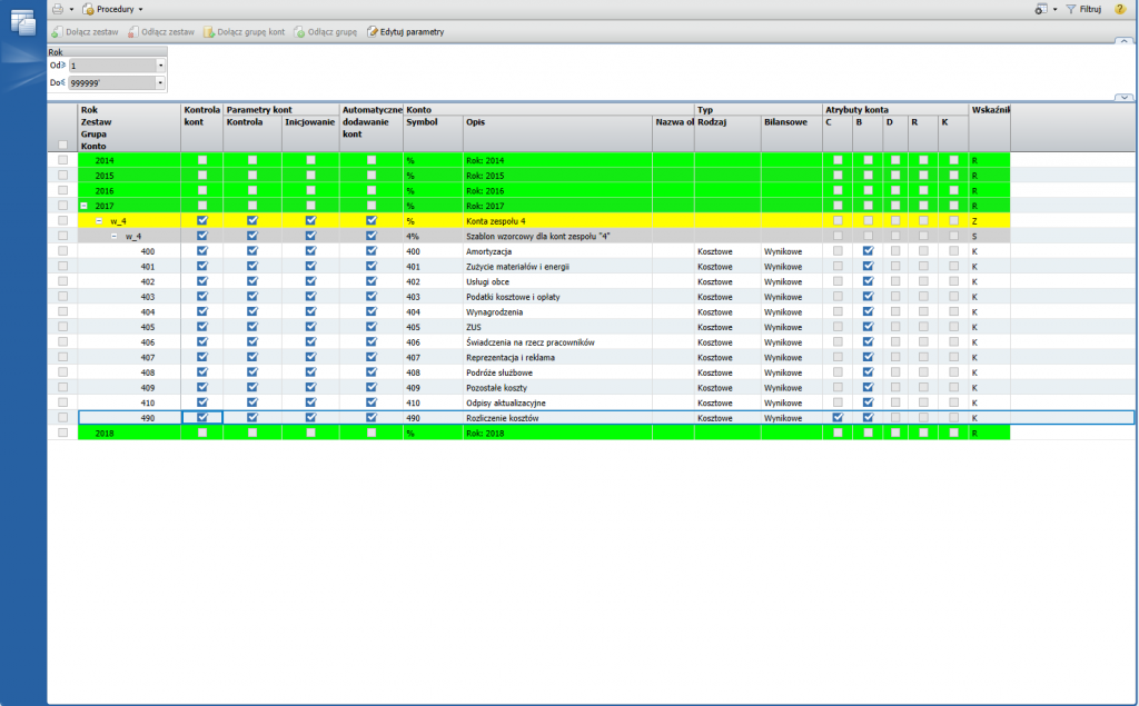 W tym celu (wykorzystując słownik Definicja kont wzorcowych) zdefiniowano wzorzec kont zespołu 4 (w_4). Wzorzec zawiera konta syntetyczne o symbolach od 400 do 490 oraz definicję kont analitycznych. Niektóre z kont wykorzystują słowniki analityczne zawierające (jak np. konto 400) grupy środków trwałych. Każde z kont we wzorcu ma swój opis oraz zdefiniowane parametry: rodzaj konta, bilansowość, walutowość, itp.