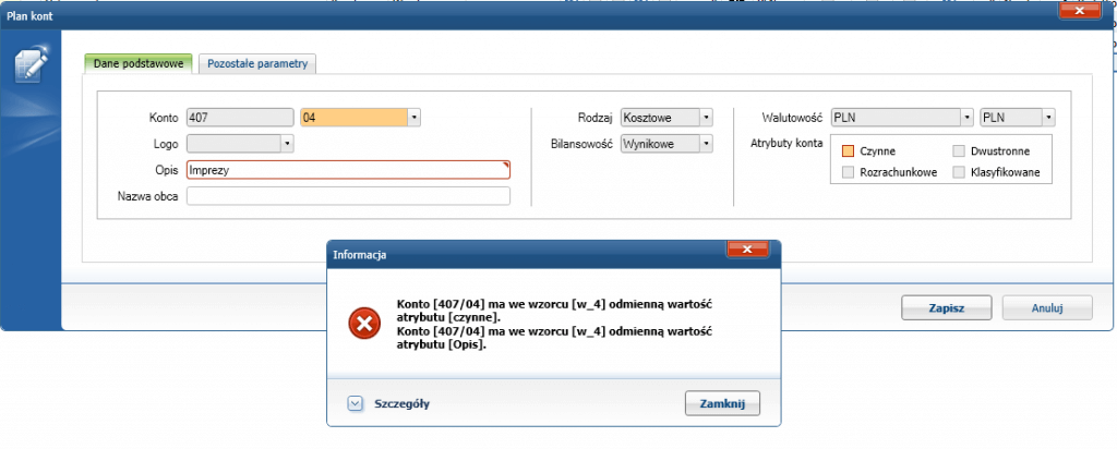 W jednostce zależnej BETA grupy kapitałowej dział księgowości chce zdefiniować nowe konto syntetyczne o symbolu 407/04 i opisie „Imprezy”. Po wprowadzeniu symbolu i opisu, przy próbie zapisania danych wyświetlany jest komunikat o niezgodności opisu konta oraz atrybutu Czynne z wzorcem.