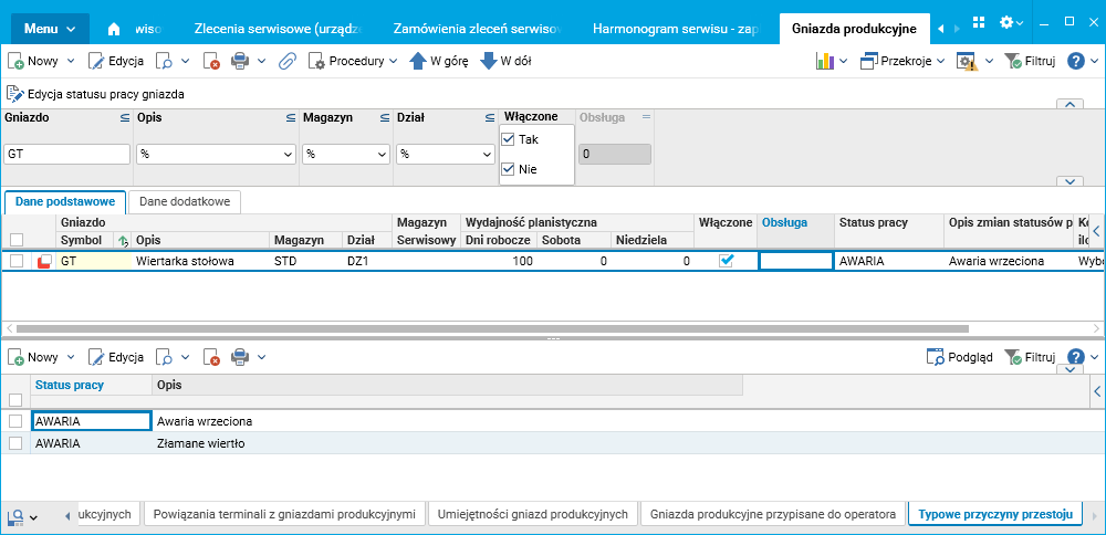 W słowniku Gniazda produkcyjne dodano pola Status pracy i Opis zmian statusów pracy z informacją o ostatnim stanie pracy gniazda. Ponadto do menu dodano procedurę Edycja statusu pracy gniazda służącą do edycji statusów pracy gniazda. Dzięki temu możliwe jest rejestrowanie przyczyn przestojów gniazd produkcyjnych oraz typowych przyczyn awarii urządzeń.