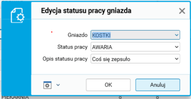Procedura zawiera parametr Opis statusu pracy. Opis statusu jest dostępny tylko dla statusów pracy powodowanych przestojem (ustawiony dla statusu checkbox Przestój w słowniku Statusy pracy) i powinien opisywać przyczynę przestoju. Wpisy ze szczegółu Typowe przyczyny przestoju służą jako źródło wartości dla listy rozwijanej pola parametru Opis statusu pracy.