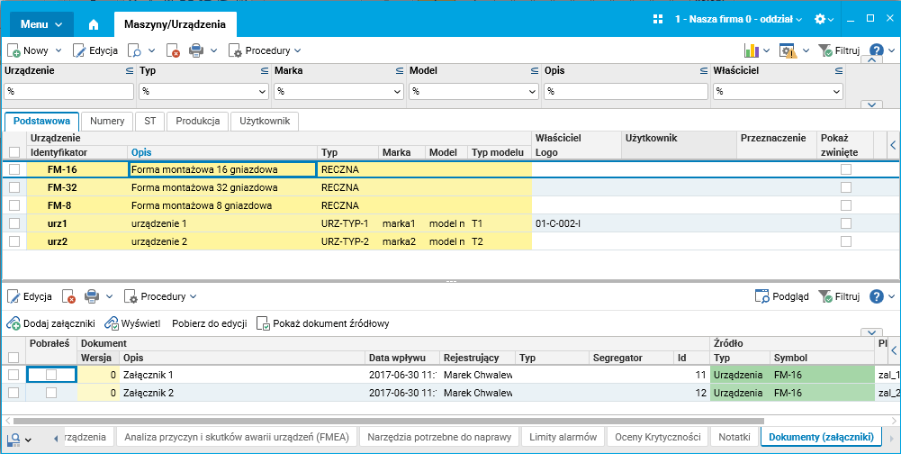 Rys. Szczegół Dokumenty (załączniki) słownika Maszyny/Urządzenia