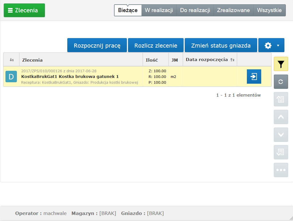Nowe bezparametrowe procedury Rozpocznij pracę oraz Rozlicz zlecenie widoczne są dla listy zleceń (okno Zlecenia) o statusie Bieżące i Do realizacji. Zmieniona została również widoczność pozostałych procedur dostępnych dla listy zleceń. Stale widoczna jest teraz procedura Zmień status gniazda. Pod przyciskiem z ikoną trybiku zostały ukryte procedury Zmień operatora, Zmień magazyn, Zmień Gniazdo.