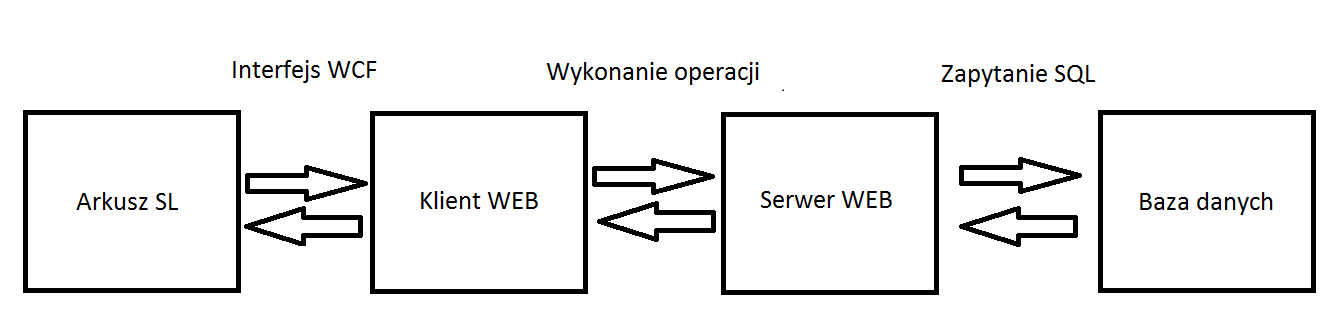 Dwustronna komunikacja z aplikacją WEB odbywa się za pomocą interfejsu WCF. Każde zapytanie SQL-owe jest wykonywane za pośrednictwem aplikacji WEB, która przekazuje je do serwera, gdzie jest wywoływane. Rezultat zapytania jest zwracany tą samą droga do Arkusza SL. Do aplikacji WEB zostały w tym celu wprowadzone operacje synchroniczne.