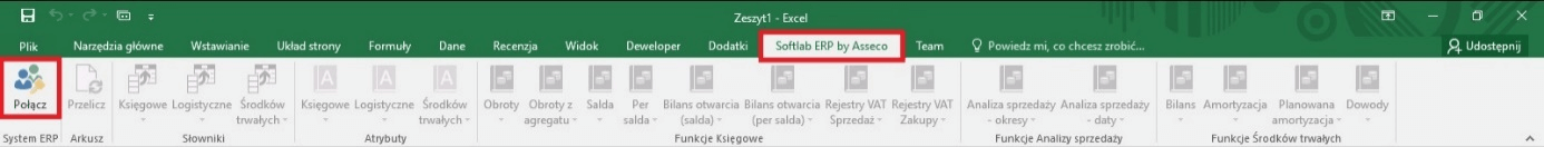 Aby rozpocząć pracę z Arkuszem SL, należy kliknąć zakładkę Softlab ERP by Asseco. Aby zalogować się do aplikacji Softlab ERP by Asseco, należy kliknąć przycisk Połącz. Zostanie wtedy wyświetlone okno logowania. Zamknięcie programu Excel spowoduje wylogowanie i zamknięcie aplikacji Softlab ERP by Asseco.