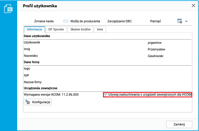Konfigurację czytnika kart zbliżeniowych dokonuje się za pomocą programu HCOM Manager (jeżeli aplikacja EXE bądź WPF z niego korzystają). W tym celu należy uruchomić HCOM Manager. Można to zrobić, uruchamiając profil użytkownika znajdujący się w prawym górnym rogu aplikacji, tam w zakładce Informacje, w sekcji Urządzenia zewnętrzne należy kliknąć przycisk Konfiguracja.