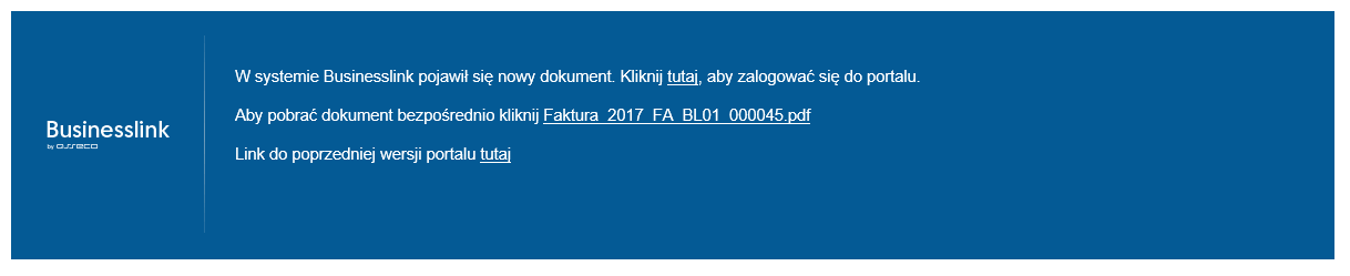 Umożliwiono pobieranie dokumentu z Businesslink bezpośrednio z maila. Po kliknięciu w link znajdujący się w wysłanym mailowo powiadomieniu można zalogować się do portalu i pobrać dokument lub pobrać dokument bez logowania do portalu.